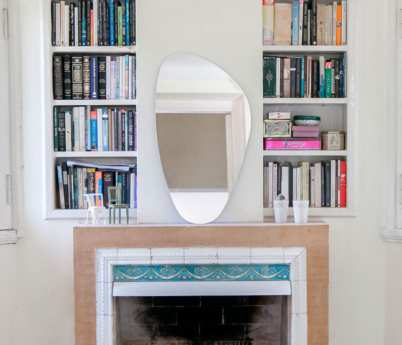 Espejo de forma oval con forma lúdica que recrea y define los espacios con un toque deco.