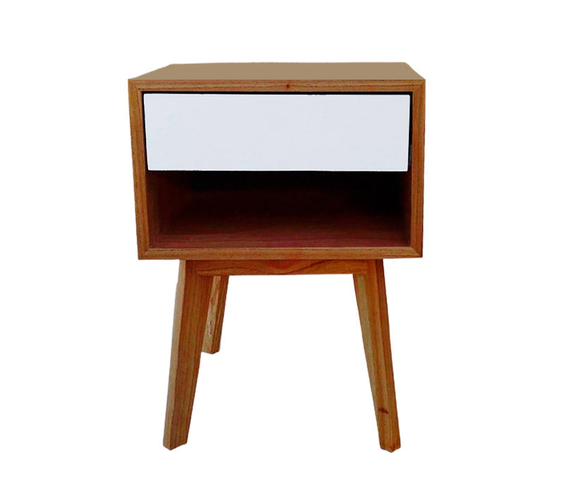 Mesa de luz. Fabricada en maciza y placa enchapada en paraíso con terminación en lustre natural semi mate.Cajones blancos u...