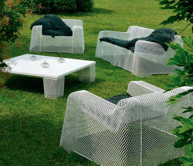 Este sofá para la vida al aire libre con estilo industria se caracteriza por su diseño lineal con asientos sinuosos y suaves. Lo que lo hace único es la red metálica de chapa de acero, que crea especiales juegos de vacíos y llenos, logrando un efecto aéreo de ligereza. La grandeza de los grandes formas vacías que incorporan la naturaleza combina la armonía de los motivos tramado, en un equilibrio único.