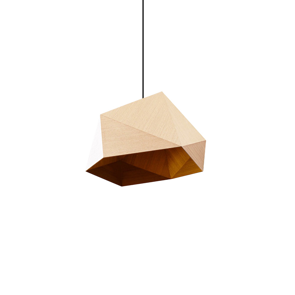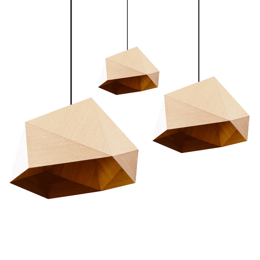 Es una lámpara colgante geométrica hecha de facetas triangulares. Sus vistas desde todos los ángulos son diferentes pero igualmente llamativas. Totalmente envuelto en una hermosa chapa de madera.