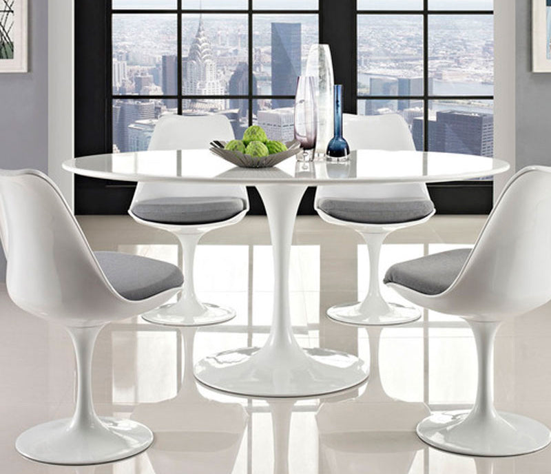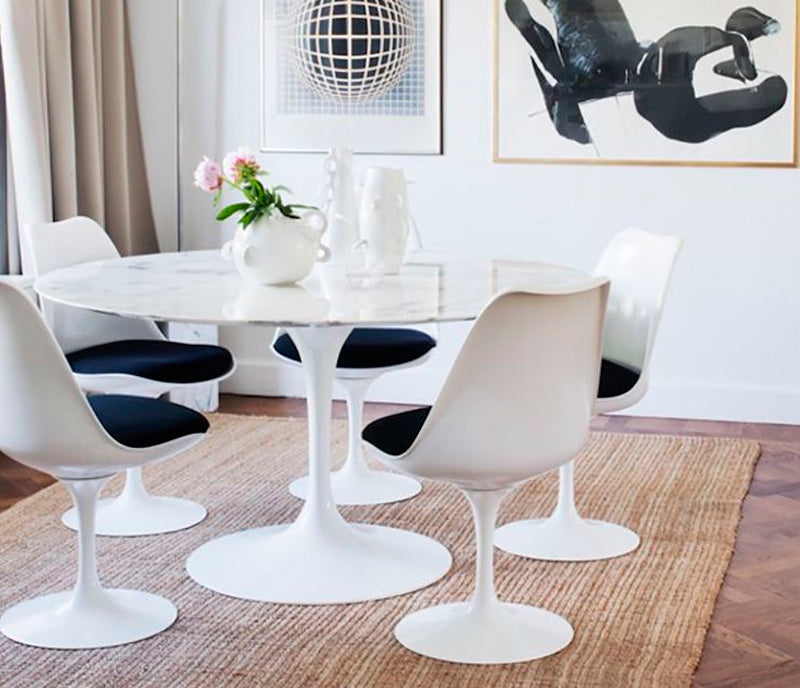 La línea Tulip se compone por sillas con y sin apoyabrazos, banquetas y mesas y se caracteriza por dejar de lado la idea de patas y en vez de eso poseer un sola base como pata única.